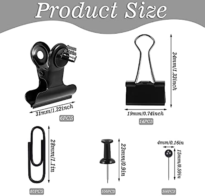• 【Size Details】The size of the black binder clips is 1.33*0.74 inches, the size of the pushpin clip is 1.22inch, the length of the nail is 0.35 inches, the size of the black pushpin is 0.9inch, the size of the black paper clip is 1.1 inches, map pin size is 0.59 inches, ball diameter is 0.16 inches