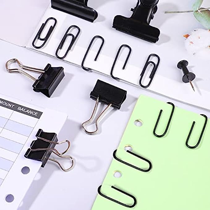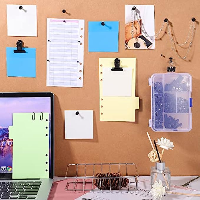 • 【Easy to Use】The black thumb tacks is inserted directly into the cork board and will not fall off. It is suitable for bulletin boards and maps to mark important information. The black binder clips and paper clips are easy to open and close, suitable for storing papers, notes, photos, etc