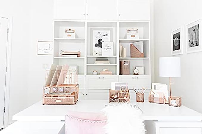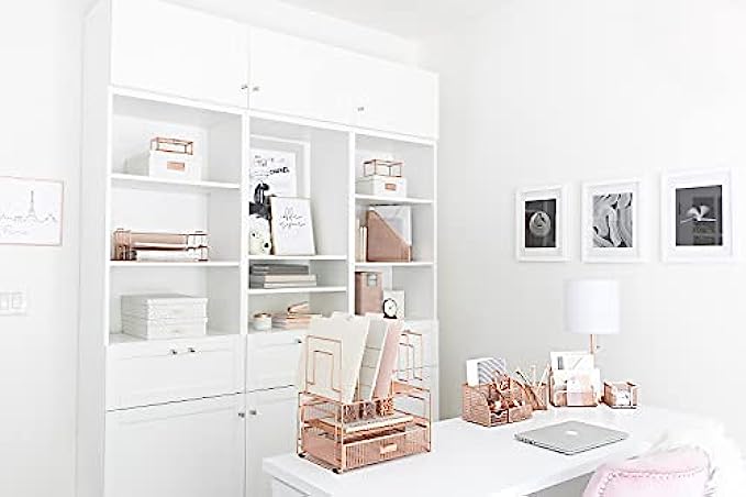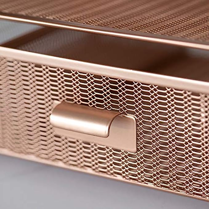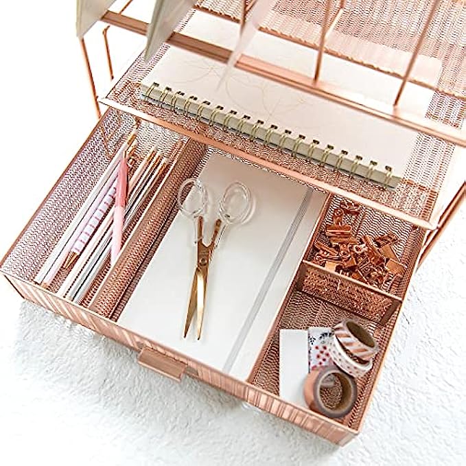 • MODERN, SPACE SAVING DESIGN: Organization does not have to be difficult. Made of metal finished in rose gold and featuring a unique mesh design, this Vertical and Horizontal File and supplies organizer with drawer and letter sorter keeps things organized and saves space.