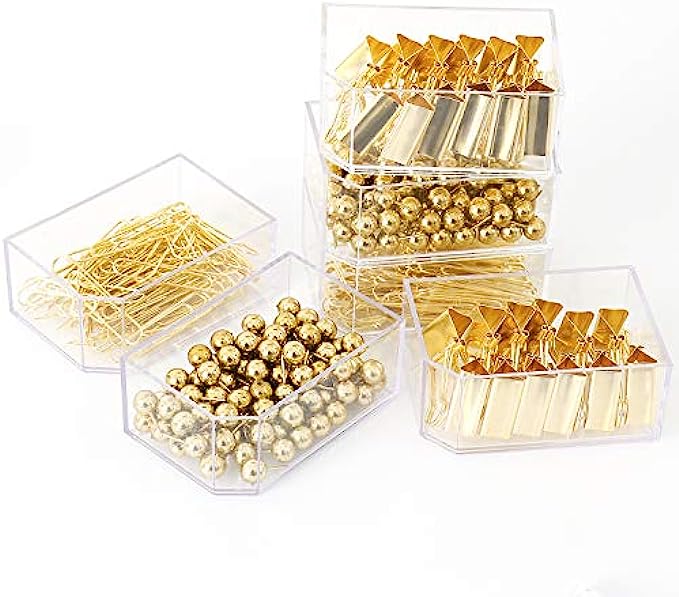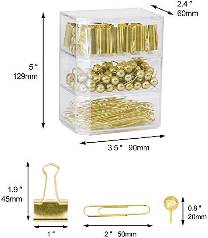 12pcs 25mm binder clips,70pcs 50mm paper clips,100pcs push pin(0.8inch).Packed in a reusable clear acrylic box to keep your desktop or your desk drawer organized