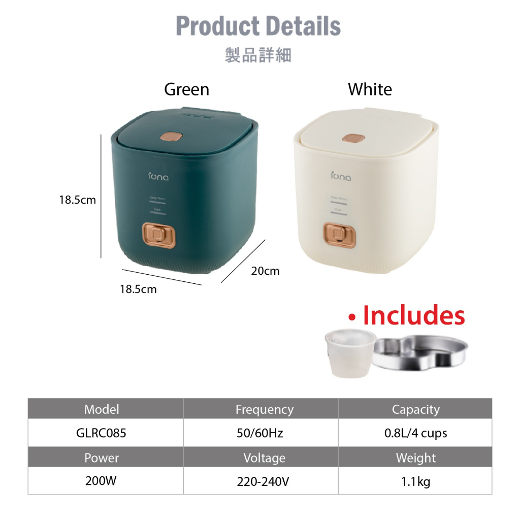 IONA 0.8L Small Mini Rice Cooker Non Stick With Steamer | Multi Function Rice Cooker | 一鍵式电饭锅 電飯鍋 - GLRC085